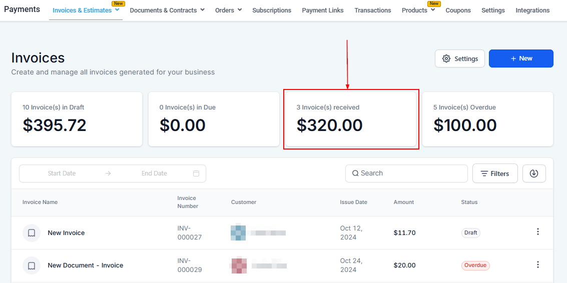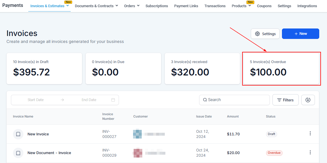 - Overdue: Quickly see how many of the sent invoices are overdue for payment.
