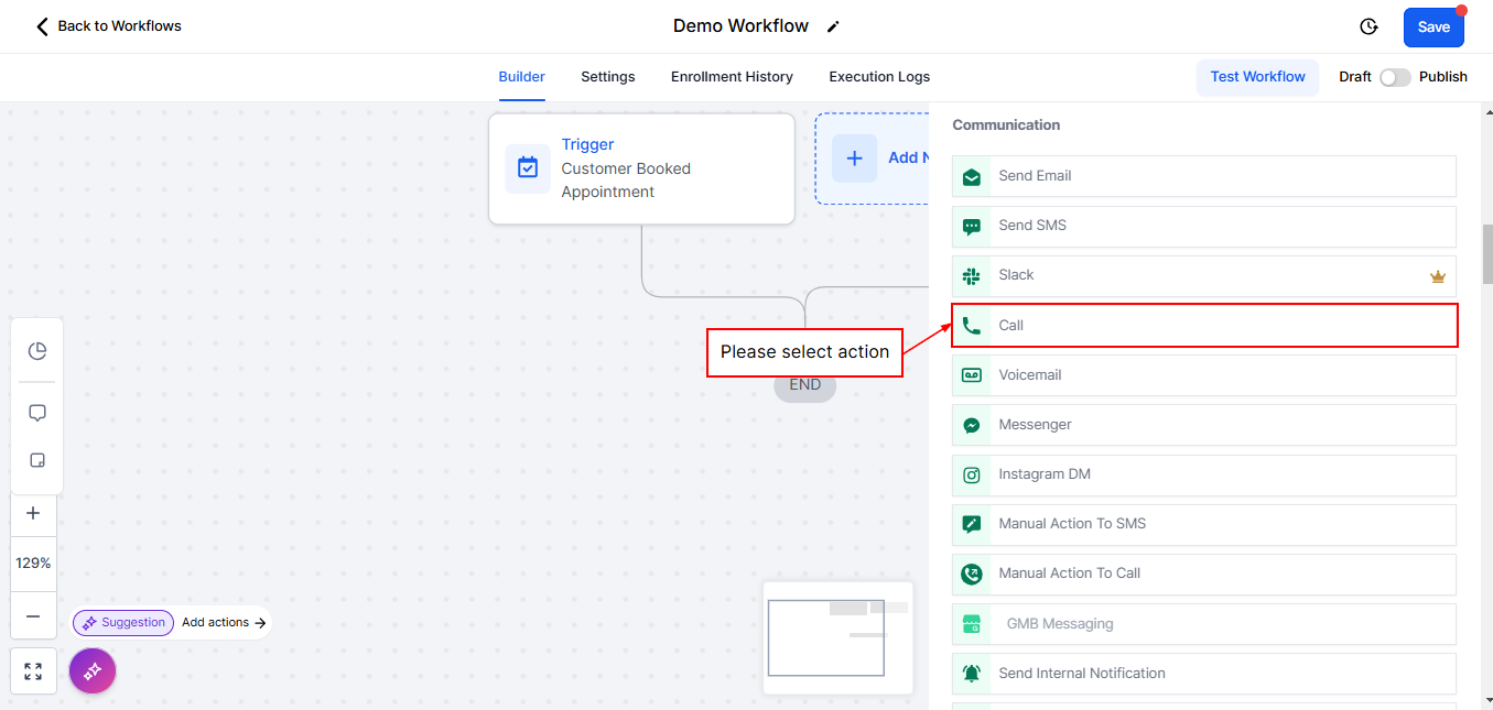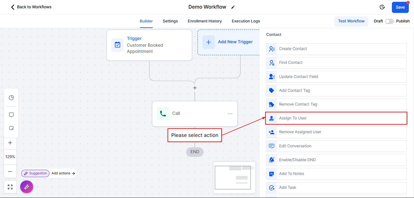 To ensure calls are routed effectively, use the Assign to User workflow action above the Call action.