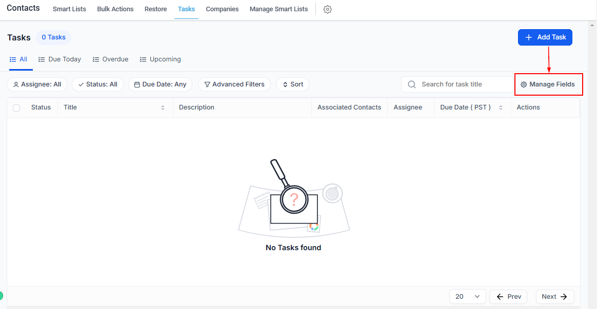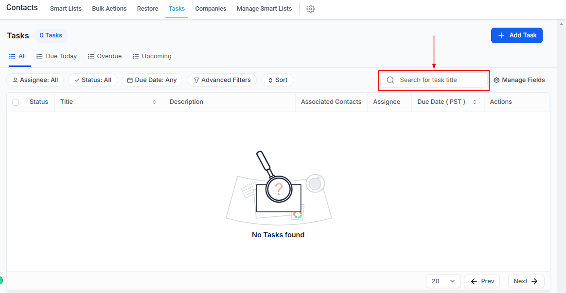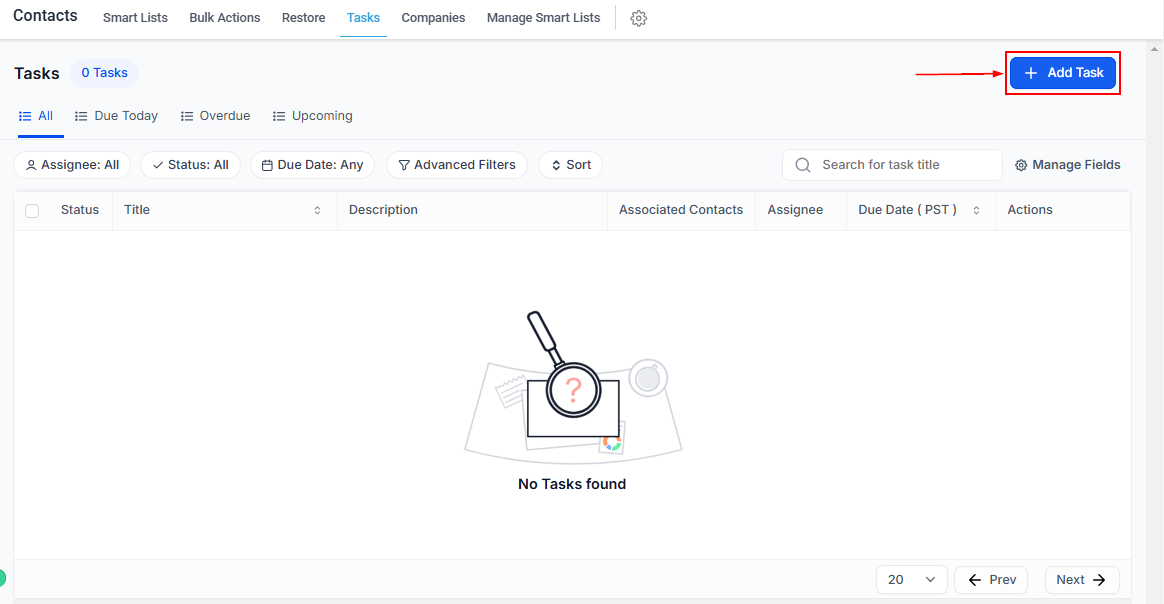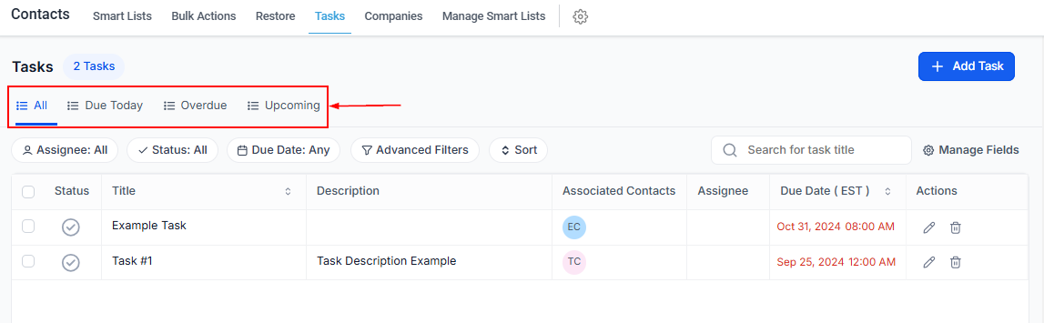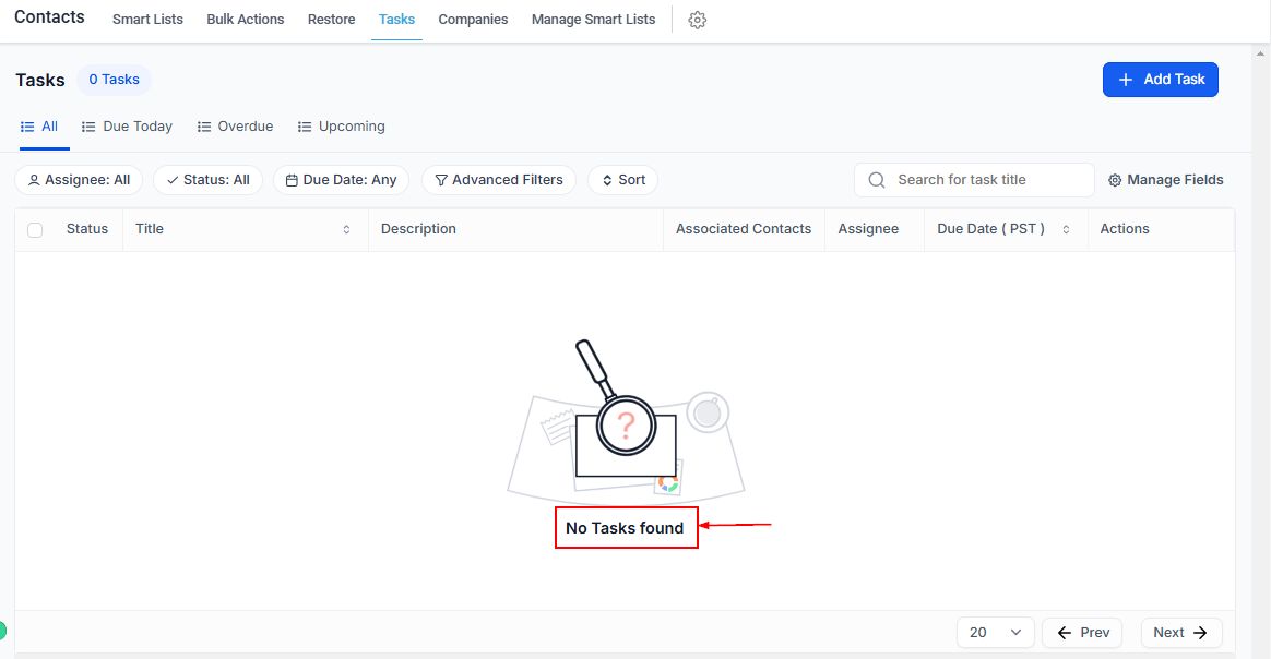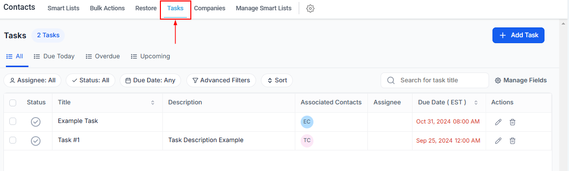 The Tasks section within the Contacts tab offers a comprehensive overview of tasks assigned to various team members and linked to specific contacts, enabling you to efficiently manage responsibilities and enhance productivity. Access the Tasks tab to begin.