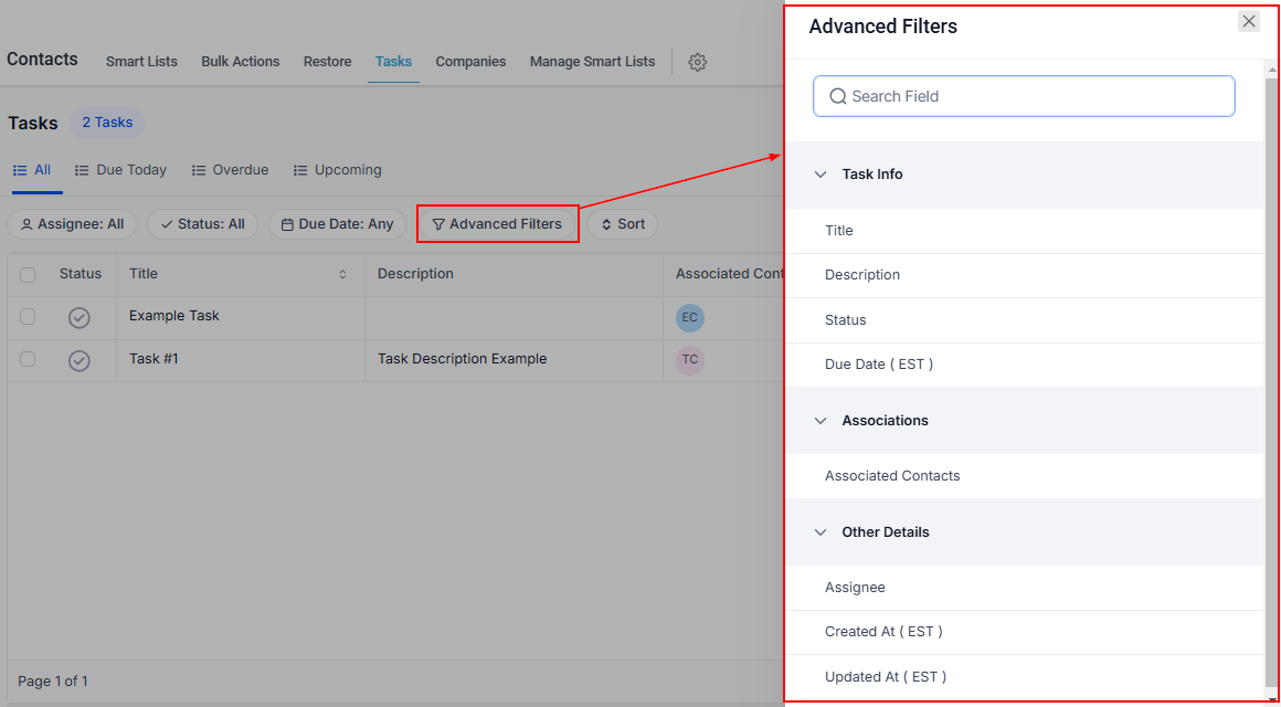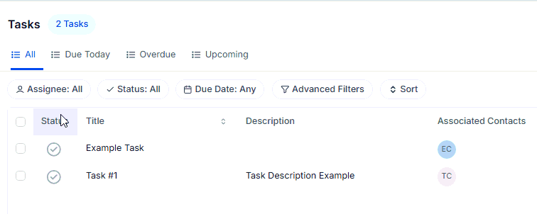 - Associated Contacts: This column shows the contact linked to each task, providing context for tasks tied to client relationships or specific projects.