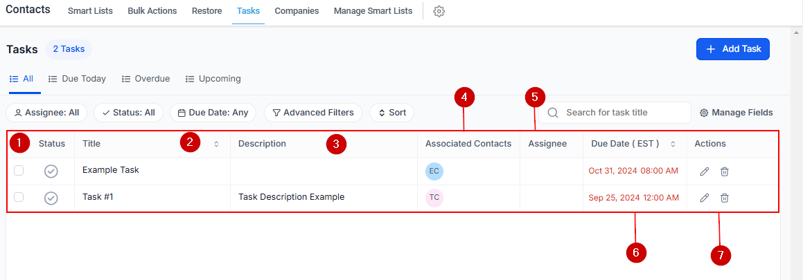 - Title: This column displays the task title. Clicking on a task will take you to the contacts section for more detailed information.
