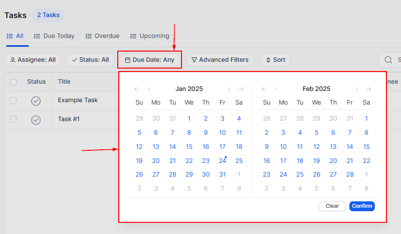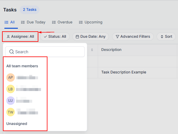 Using filters allows you to quickly locate tasks based on criteria like, Assignees, Status, and Due dates. This feature enhances task management by helping you focus on priorities.