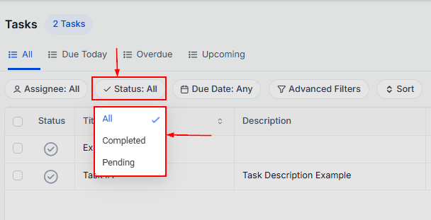 Use this filter to view tasks by their current status, such as pending or completed, helping you prioritize work.