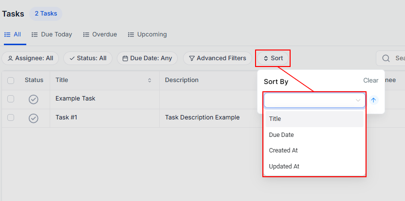 Sort tasks by creation date or due date using this tab, enabling you to manage deadlines more effectively.
