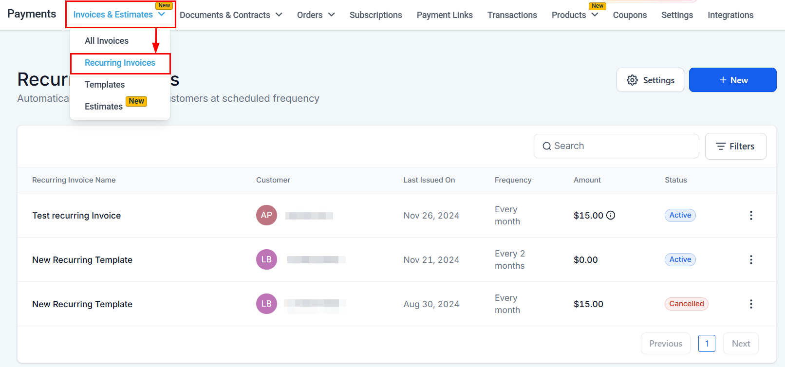 Access this section by navigating to the Payments tab, and then clicking the Recurring Invoice option from the Invoices & Estimates dropdown.