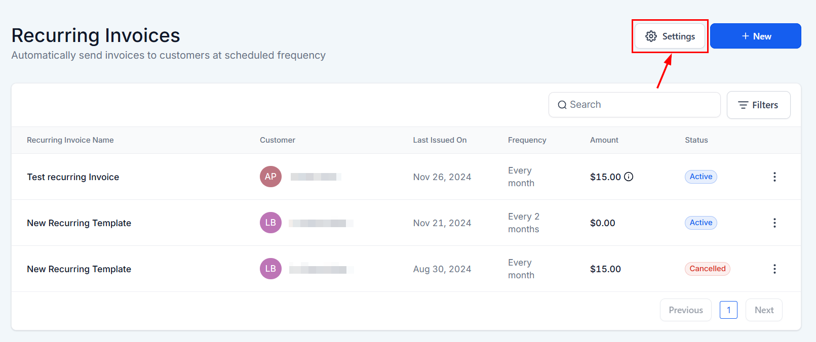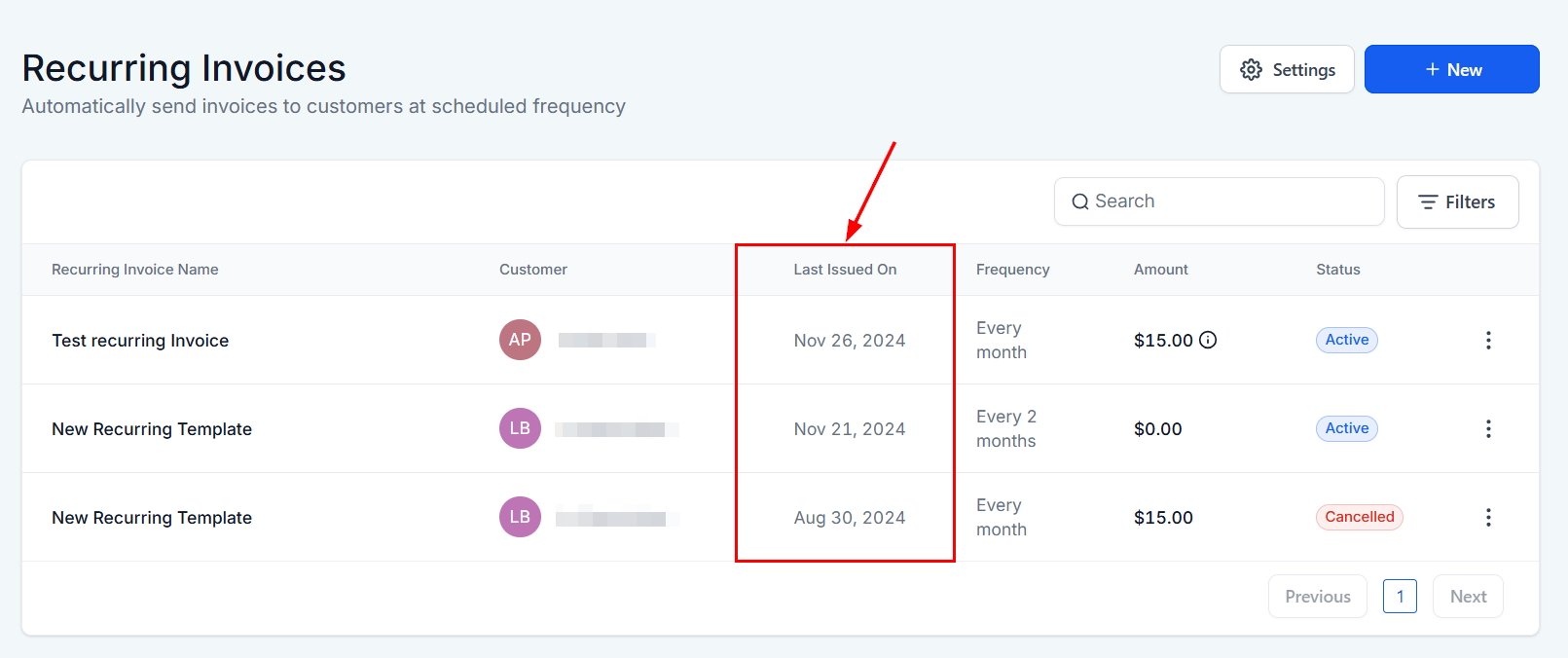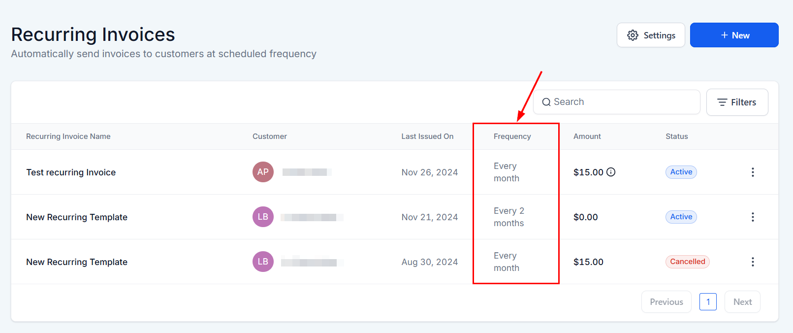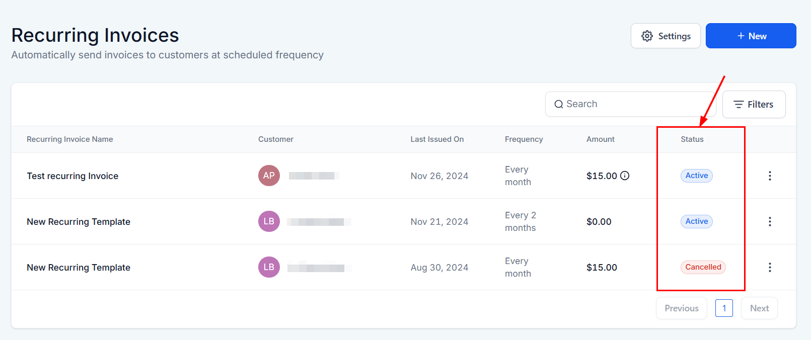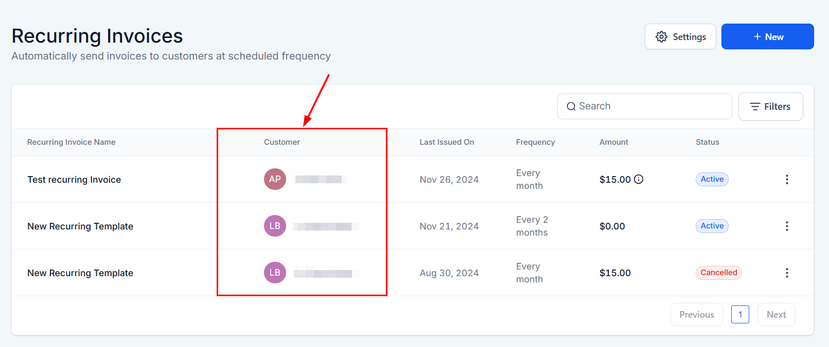 The All Invoices List serves as a central dashboard, displaying all recurring invoices within your system. Key columns include: