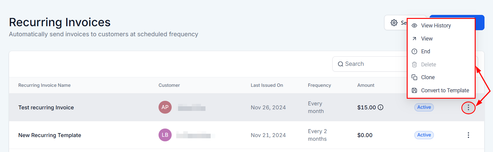 - Convert to Template: This option allows you to transform an existing recurring invoice into a template. Doing so makes it easier to replicate the settings for future invoices without the need to reconfigure billing details manually.