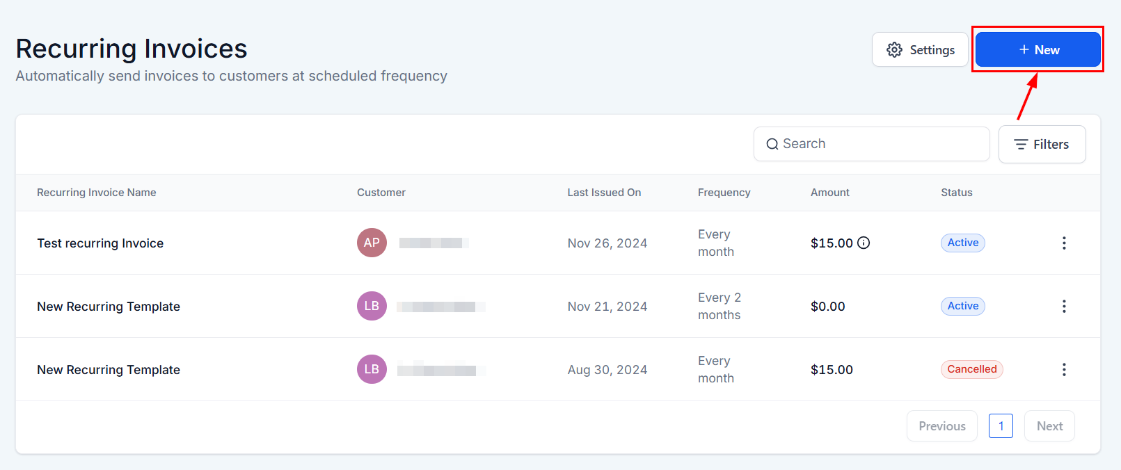 Click this button to initiate the creation of a new recurring invoice.