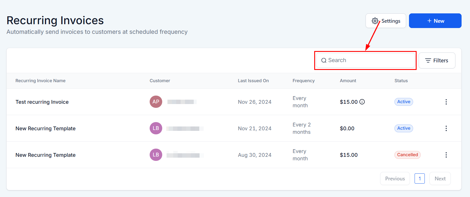 The search tool allows you to quickly locate recurring invoices based on details such as client names or associated business names. Entering specific information displays matching records, enabling efficient navigation and improving organization.
