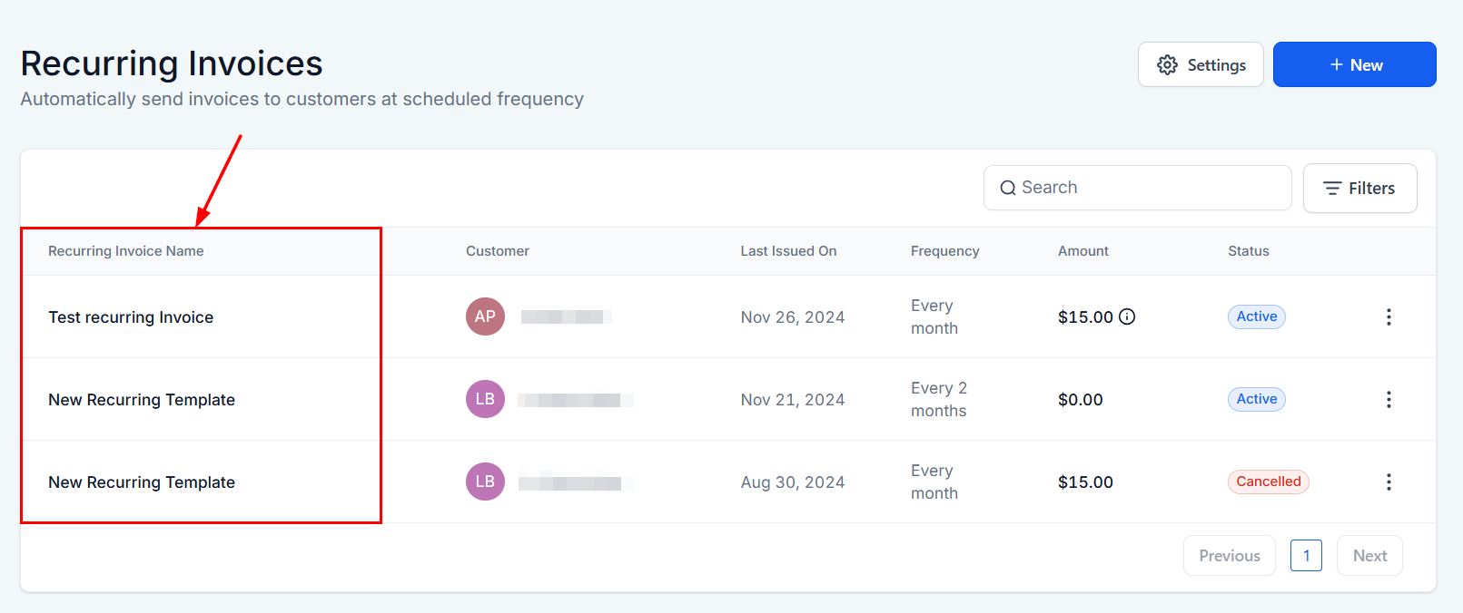 Displays the assigned name for each recurring invoice.