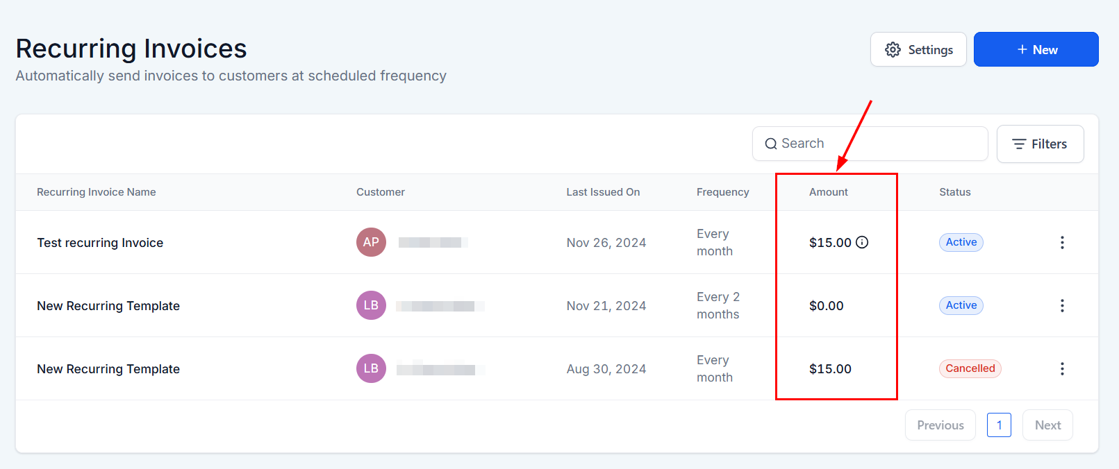 Lists the invoice amount for each recurring invoice.