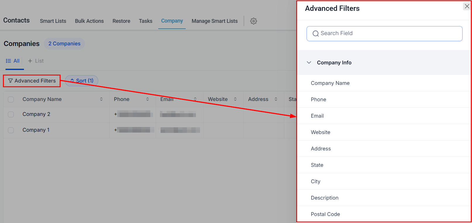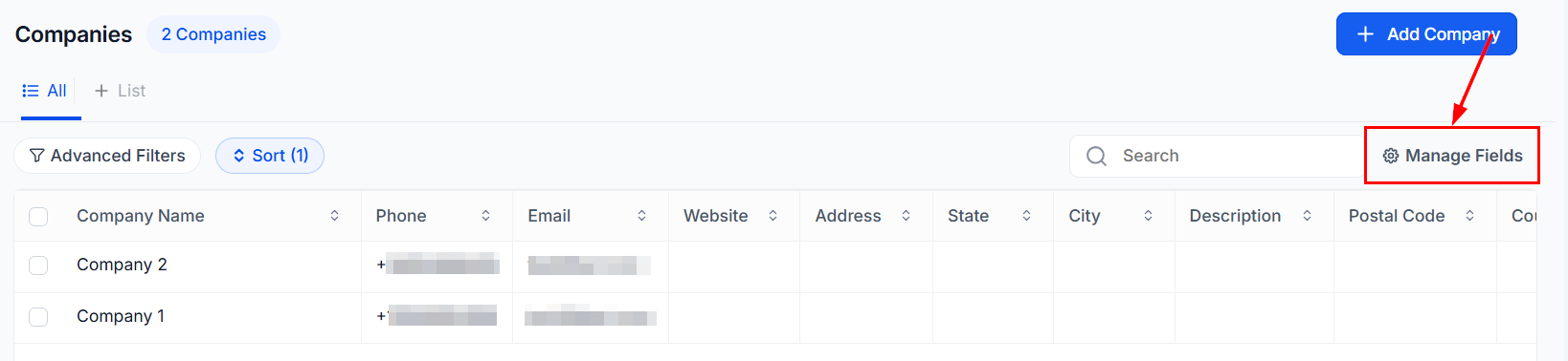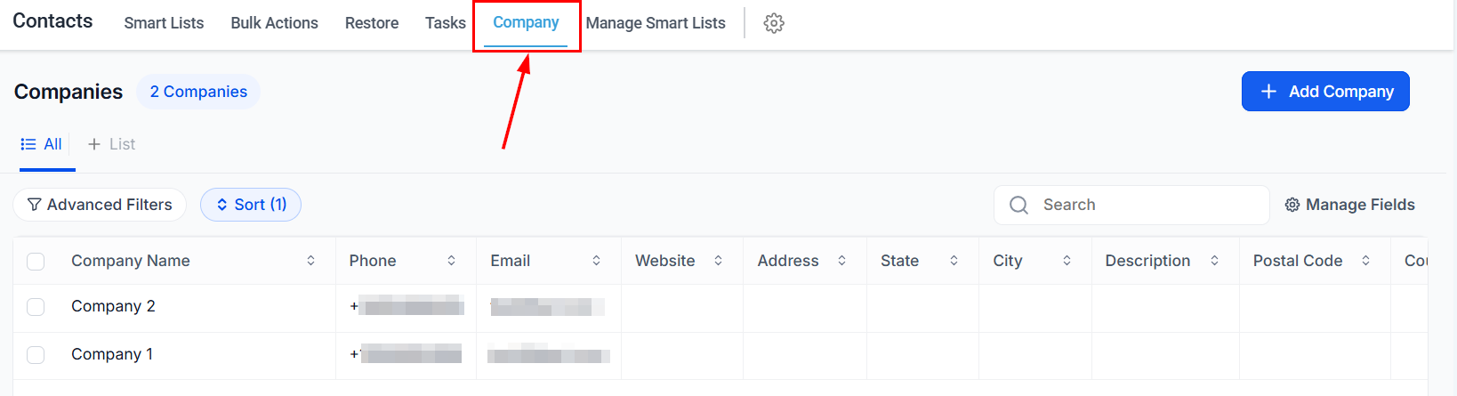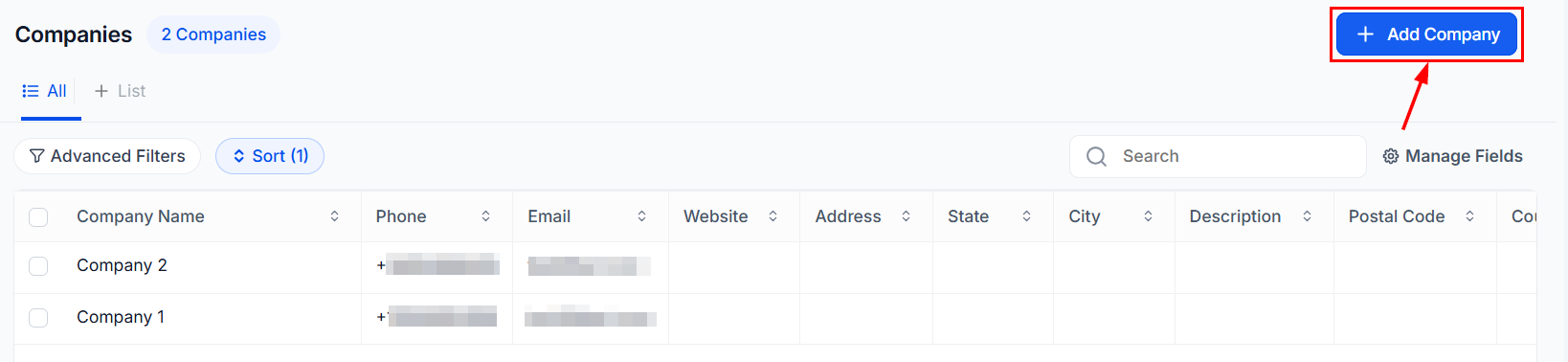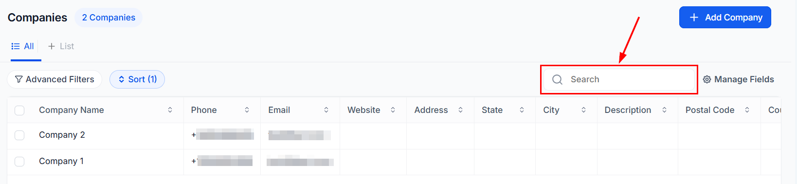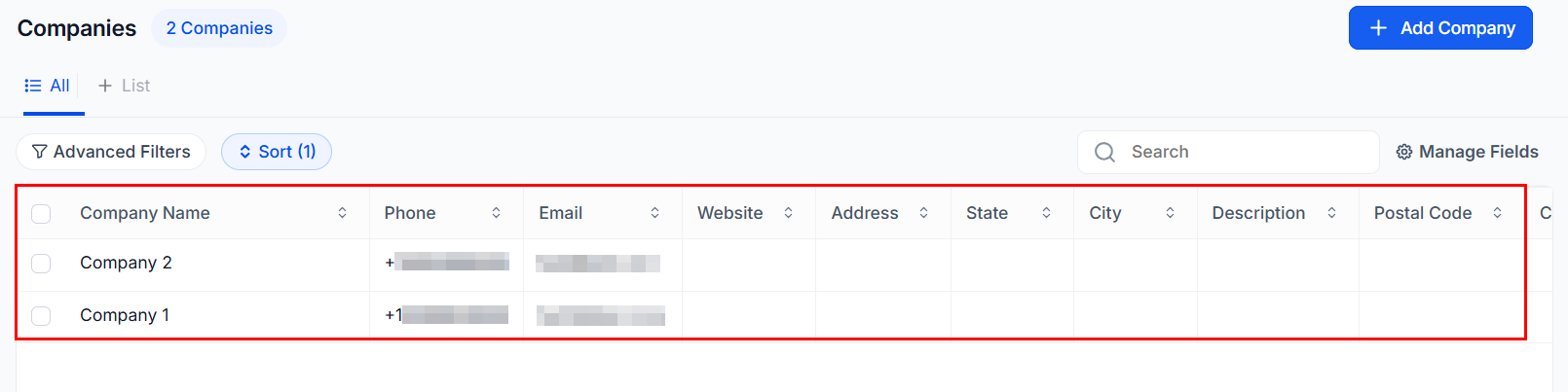 The default company table displays all the companies you have created. If any filters are applied, only the companies that meet the filter criteria will be displayed.