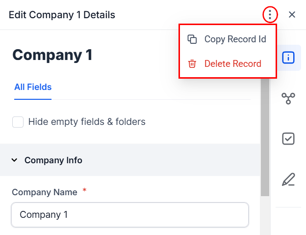 - Copy Record ID: This allows you to copy the unique identifier (Record ID) associated with the company for easy reference or use in other processes.