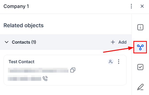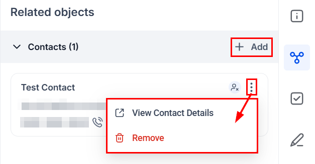 Associate additional contacts with the company by clicking the “+Add” button. To view contact details or disassociate a contact, click the three dots next to their record.