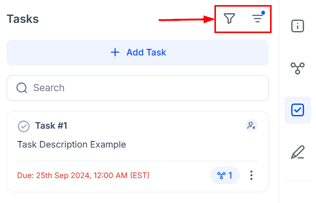 Filter the tasks by the associated contact, or sort the tasks by their created date in ascending or descending order by selecting the appropriate options.
