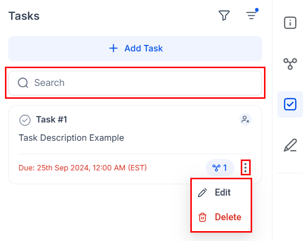 Additionally, you can efficiently locate tasks within the list using the search bar. To edit or delete a task, simply click the three dots next to the task entry.