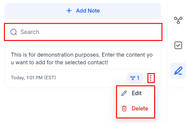 Efficiently locate notes within the list using the search bar. Additionally, you can edit or delete existing notes using the three-dot option beside each note.
