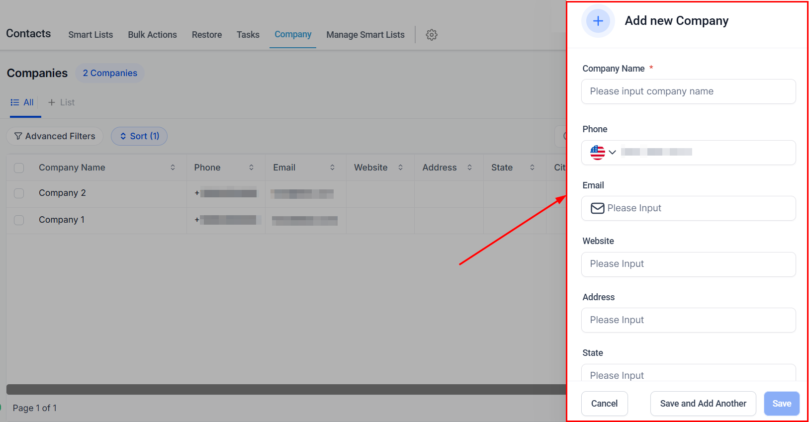 To create a new company, click the ‘+ Add Company’ button on the top right of the page. A popup will appear for you to fill in your company details. By completing the required fields, you will successfully create a new company record that can be managed and associated with relevant contacts.