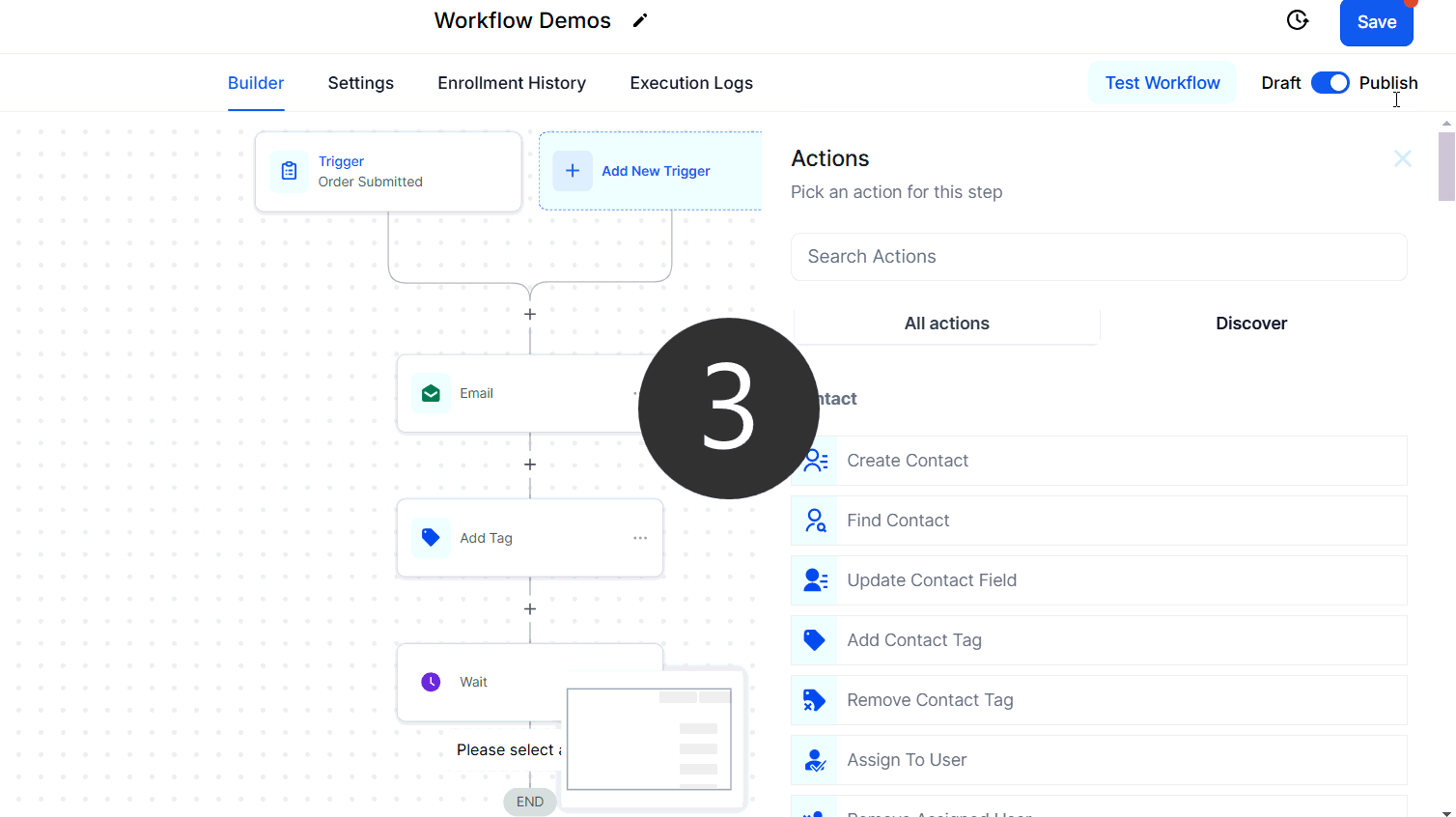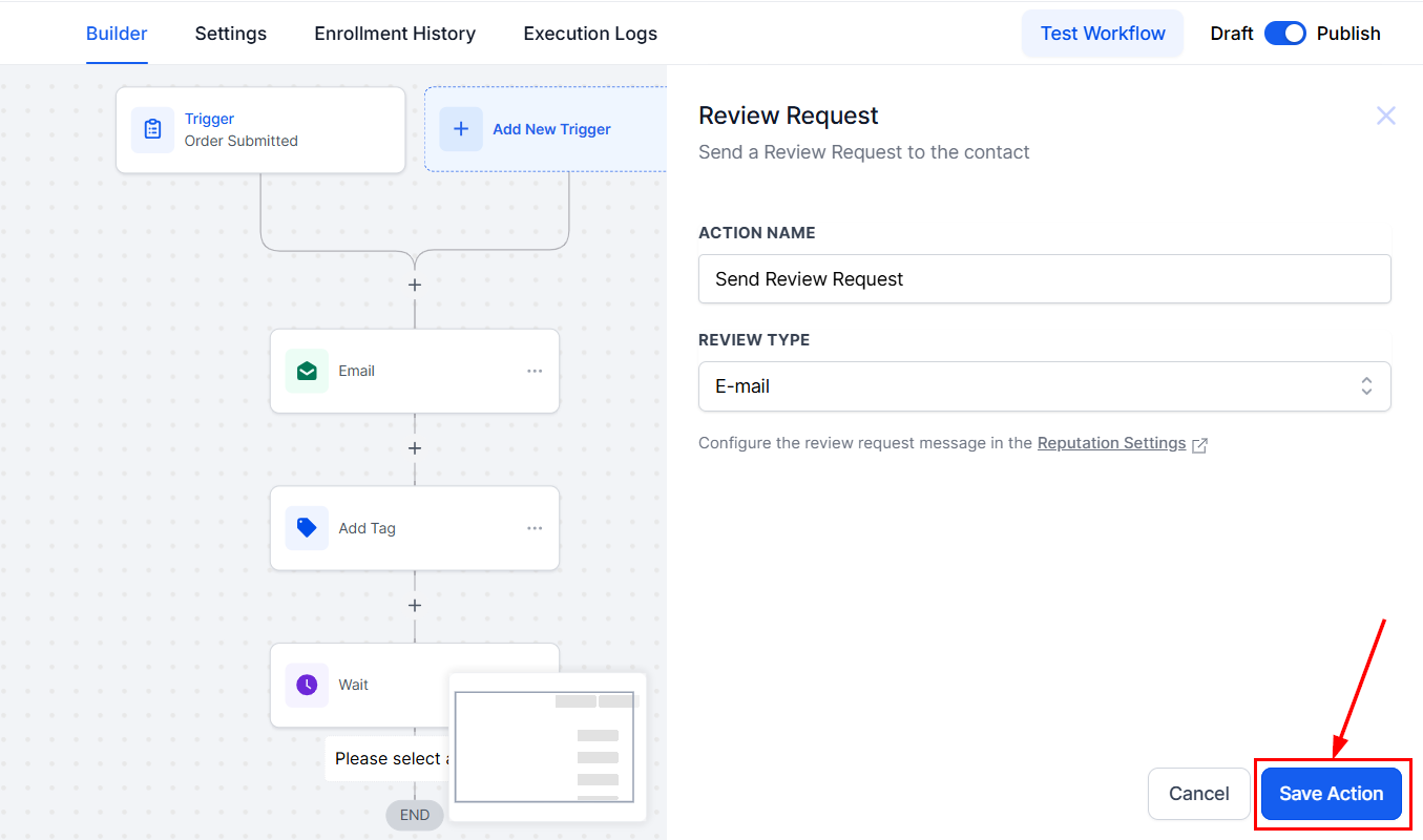Collecting feedback through reviews is essential for understanding customer satisfaction and enhancing the quality of your products or services. The process of sending review requests can be easily implemented through the system by using the Send Review Request Action in workflows. Follow the steps below to add this action to your workflow.