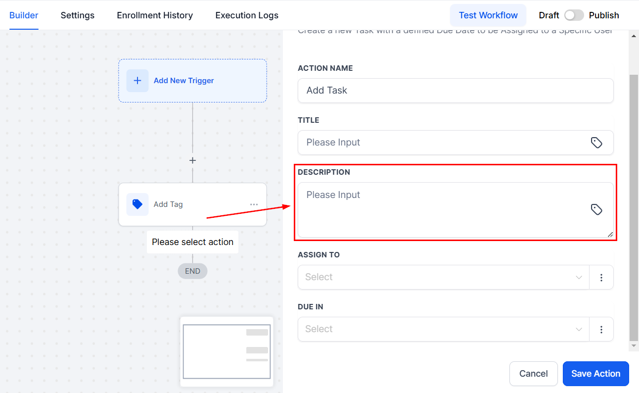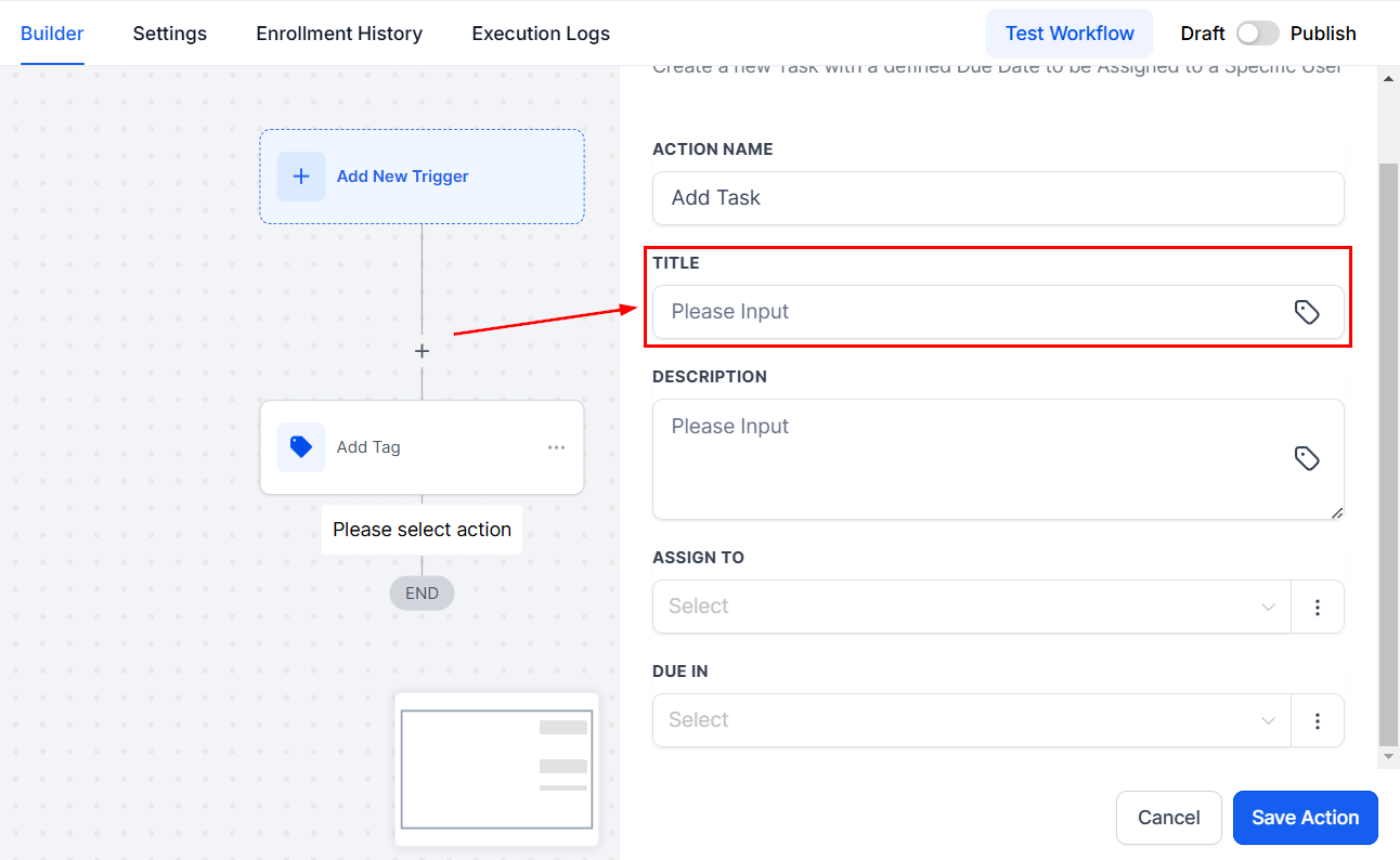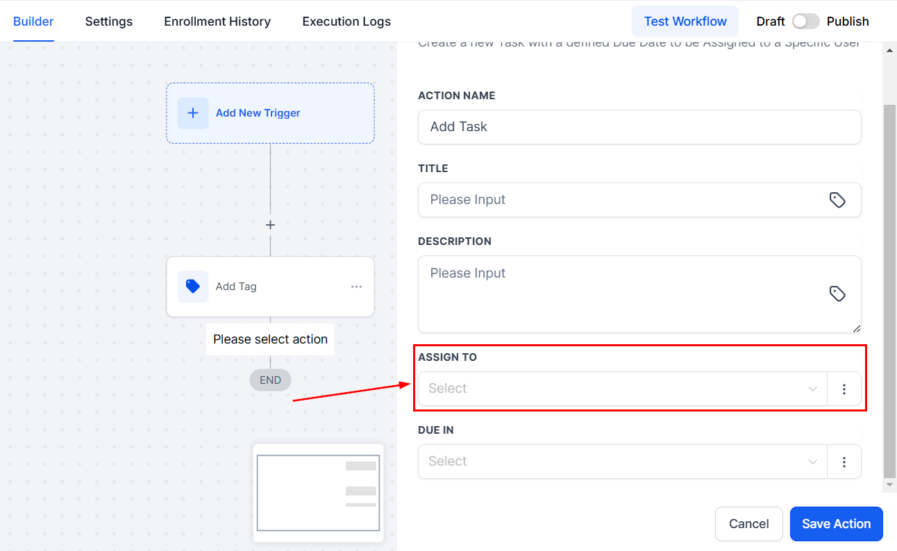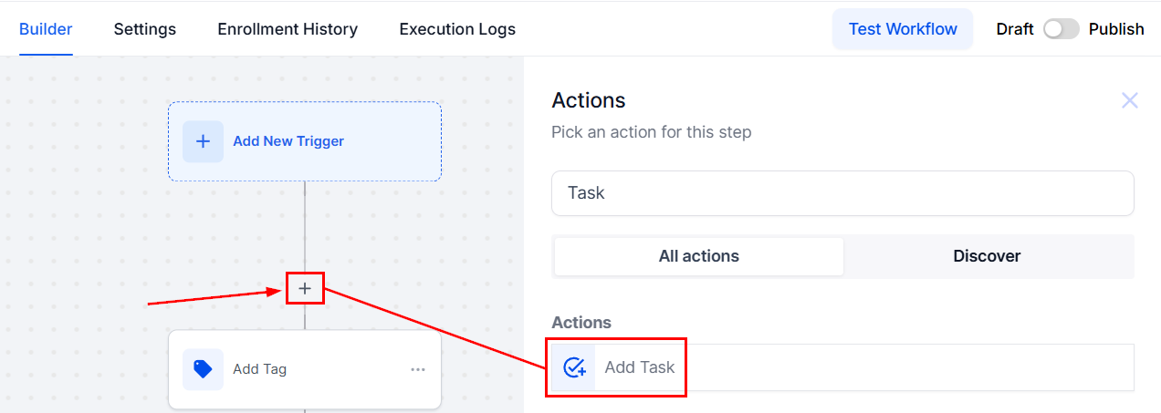 To use this feature start by creating or editing a Workflow to access the builder. Start by adding the Add Task Action by clicking the plus sign icon.