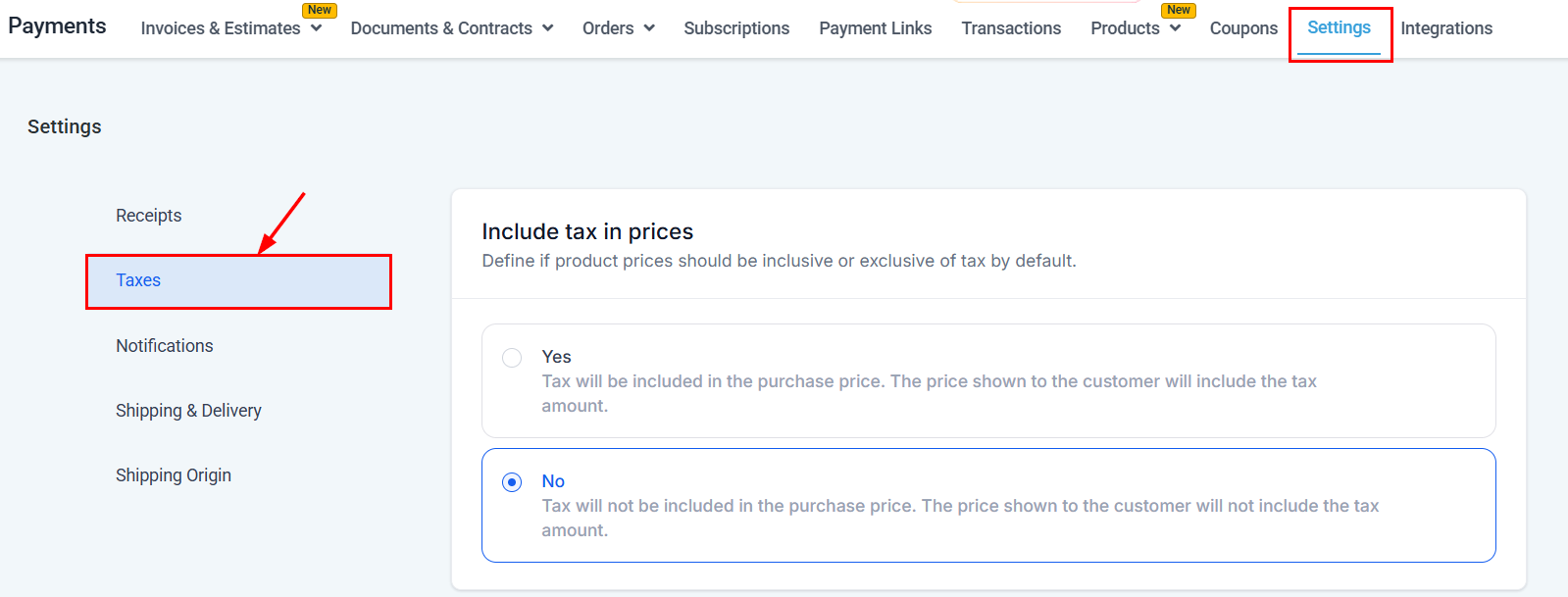 You can manage your taxes by adding them to products or invoices directly, keeping a record to follow with every sale. How to add them depends on the type of Tax you need to add, but to start go to the Settings tab inside the Payments section and select the Taxes option to your left.