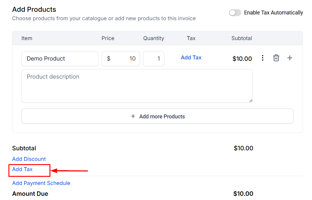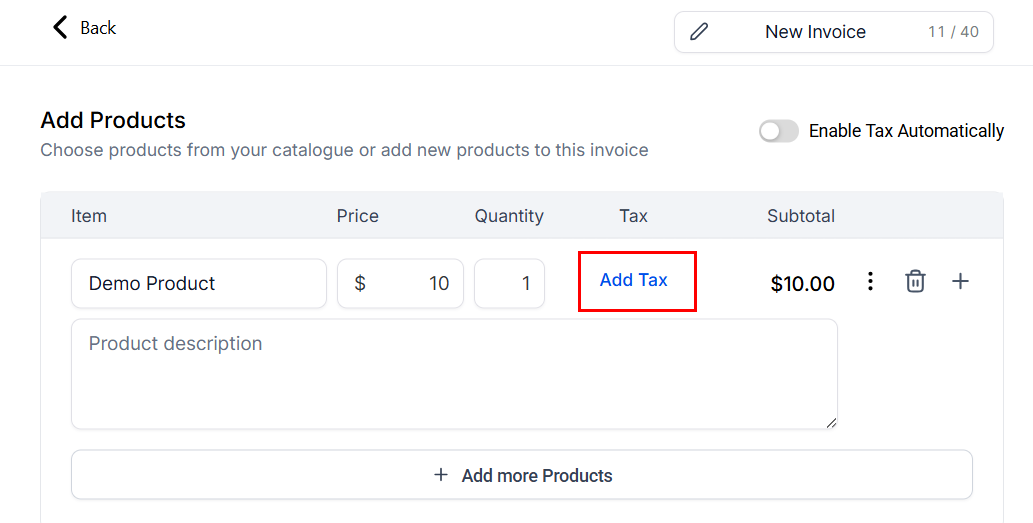 To apply taxes to all products listed in the invoice, click the Add Tax button located below the subtotal section. Configure the tax details accordingly, and then save your changes.