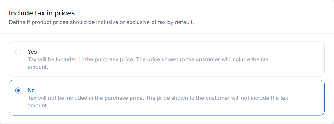 You can now specify whether product prices are tax-inclusive or tax-exclusive to ensure the right tax convention is followed. This setting can be applied to all products within this section. If no selection is made, Tax Exclusive is the default setting.