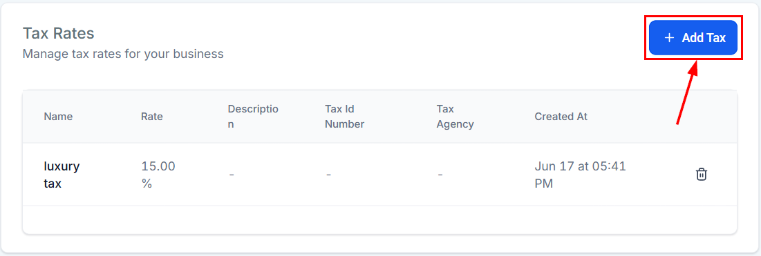 This gives you the option to create taxes on non-standardized products or businesses outside the US. To do so, click on +Add Tax.