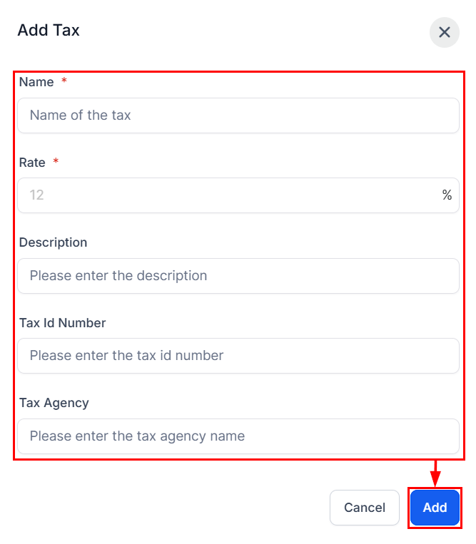 A pop-up window will open for you to add the tax information, you need to add the name and percentage for the tax, and you can also add any extra information. Once completely filled out click Add to save it to your system.