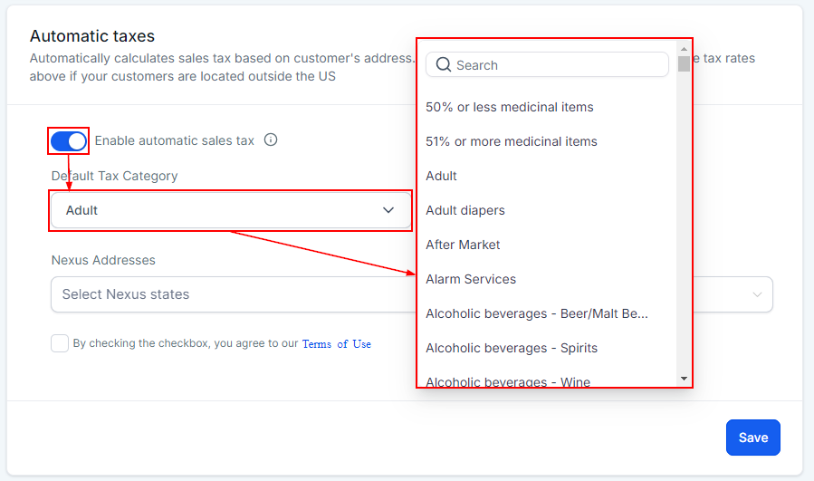 This feature automatically calculates sales tax based on the customer's address and is designed for businesses inside the US. To add them, first toggle Enable automatic sales tax, then select the category of your product for the tax percentage.