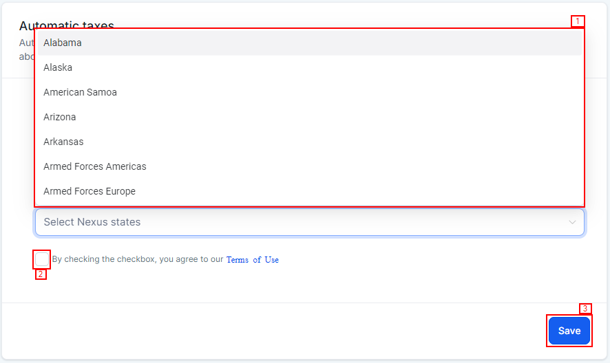 Then select the States you do business with, check the box to accept the Terms of Use, and click Save.