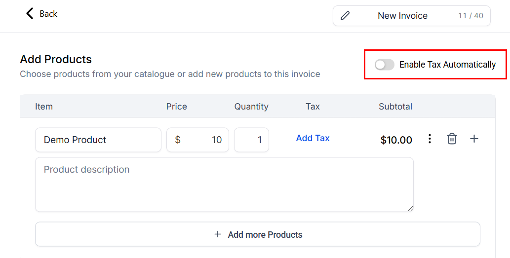 Once your taxes have been created you can start adding them to your Invoices by clicking on Add Tax to add manual taxes or toggling automatic taxes within the invoice builder. Adding them this way will tax all products in the invoice.