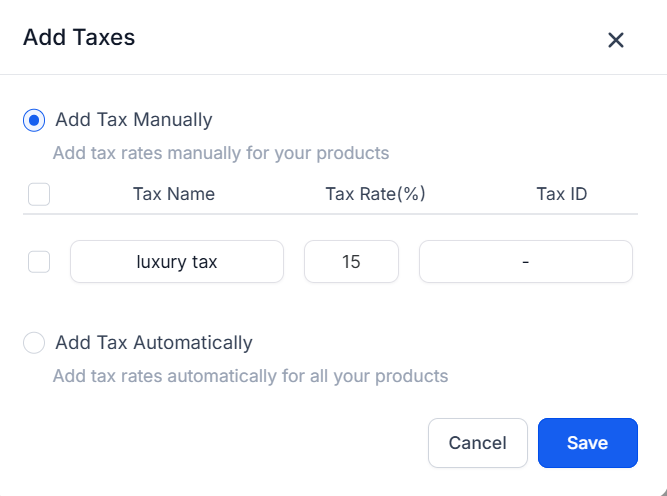 This will open a menu for you to select from your added taxes. Adding Tax Manually allows you to add different tax rates for each product, while automatic taxes are applied to the entire invoice. Once you do click on save to set it.