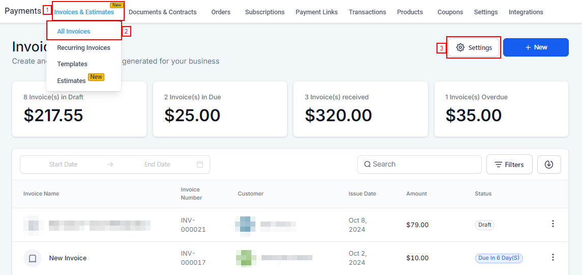 To set up late fees across all invoices, navigate to the Invoice Settings under the Payments section.