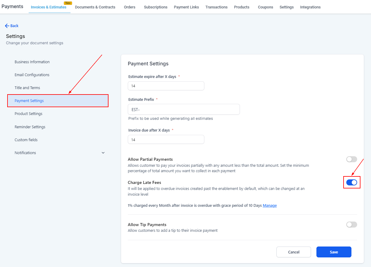 Enable the Charge Late Fees option within the Payment Settings subsection.