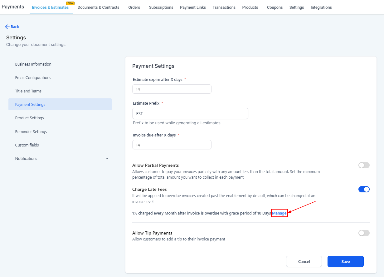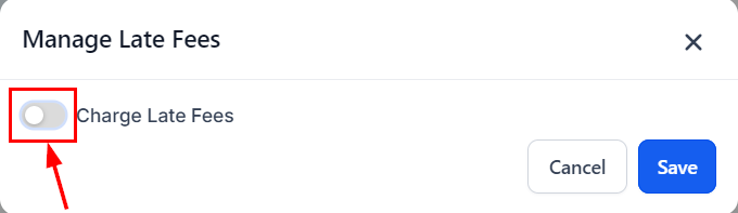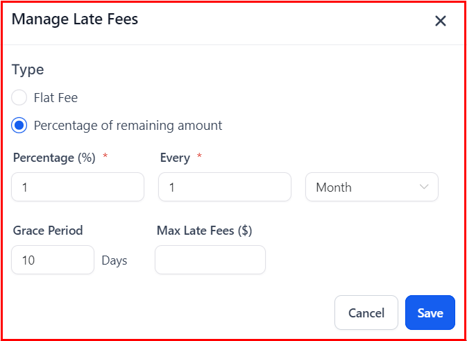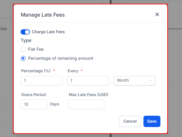 Next, click the "Manage" button to customize additional late fee settings, including the fee type, frequency, and grace period.