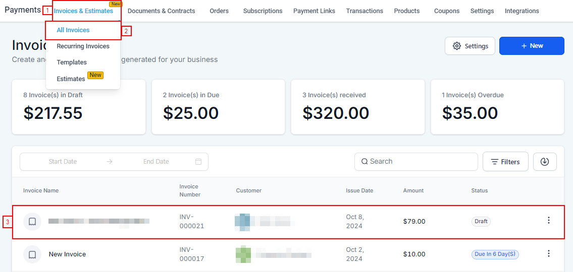 To activate late fees for a specific invoice, navigate to the invoice from the Invoice list.