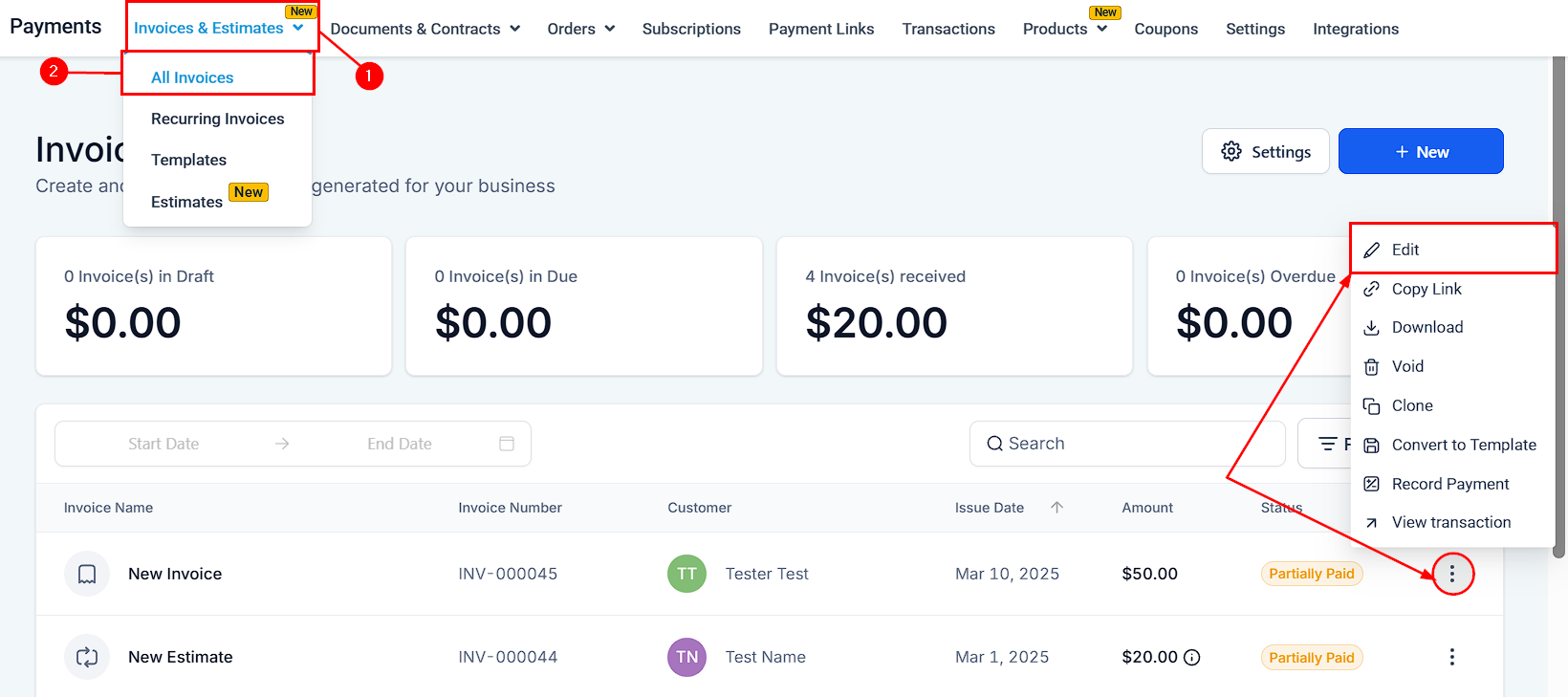 Go to Invoices & Estimates > All Invoices. Select a Partially Paid invoice, click on the three dotted button, and select Edit.