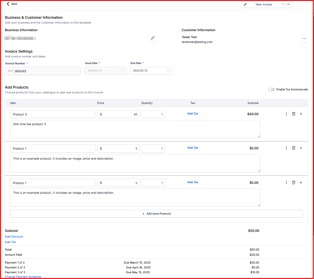 On the invoice interface, click on the Edit option for the specific section—invoice details, products, business info, or payment plans. You can change the invoice due date, name, terms, and notes. Modify payment schedules, including due dates and amounts. You can also add or remove products and update the invoice amount or business details.