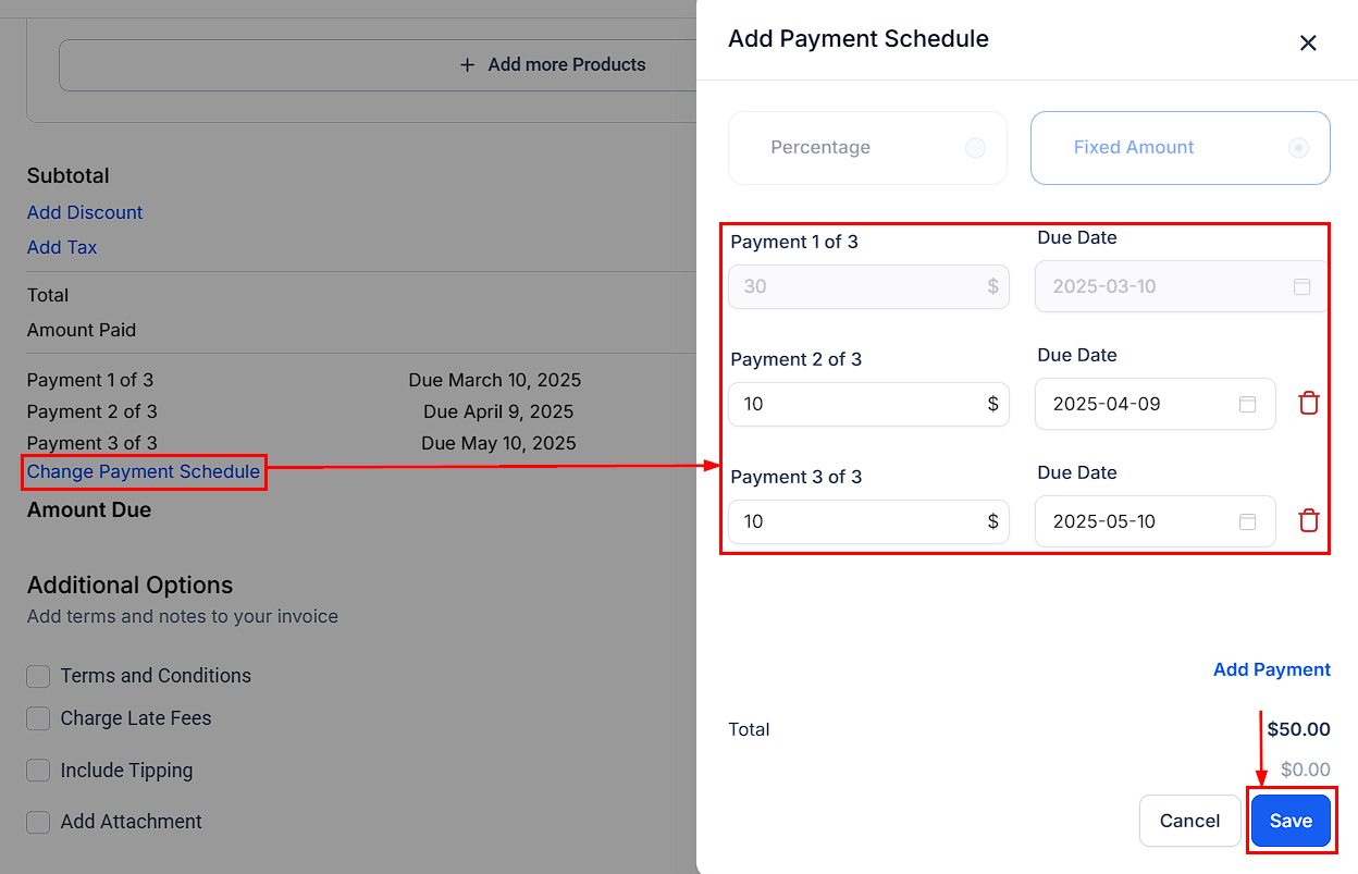 Within the invoice, scroll down and select the Change Payment Schedule option. Edit the payment amount and date as needed, then click Save to apply the changes.