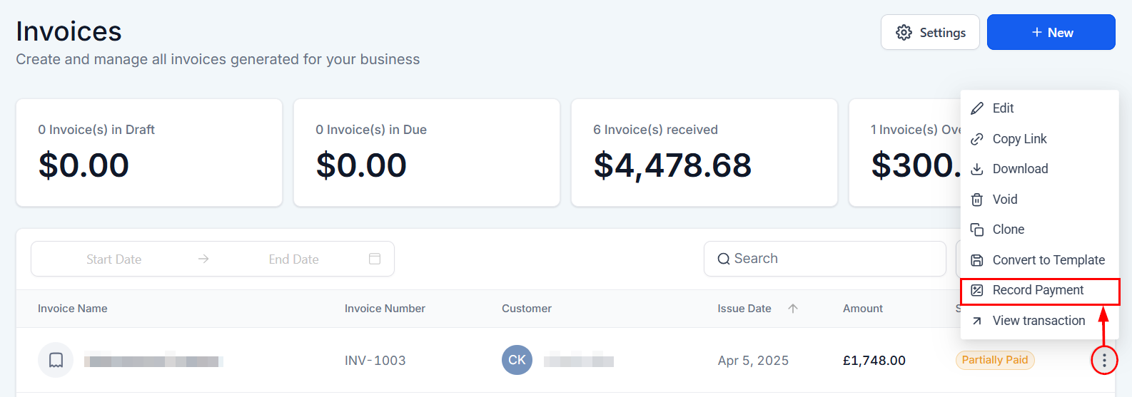 Next, locate the invoice you wish to update and select the “Record Payment” option from its actions menu.