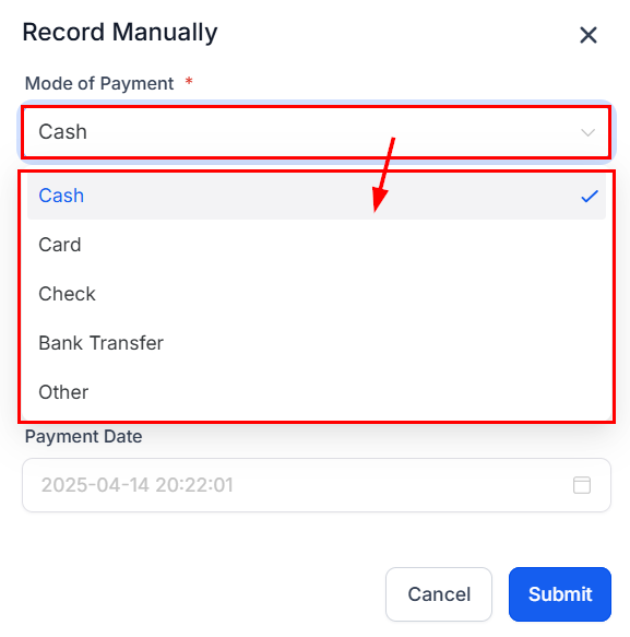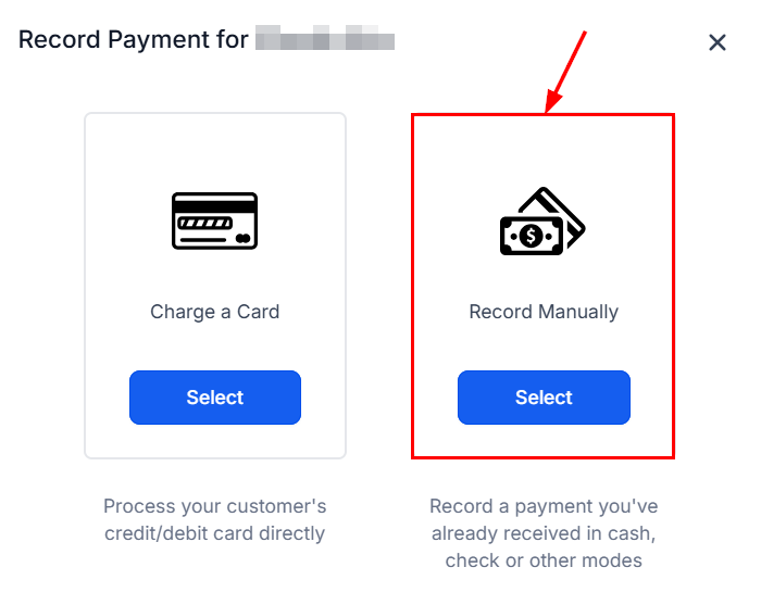 Since we are recording a manual payment, let's go ahead and select “Record Manually”. This allows you to record cash payments or any other payment that was made outside of the platform.