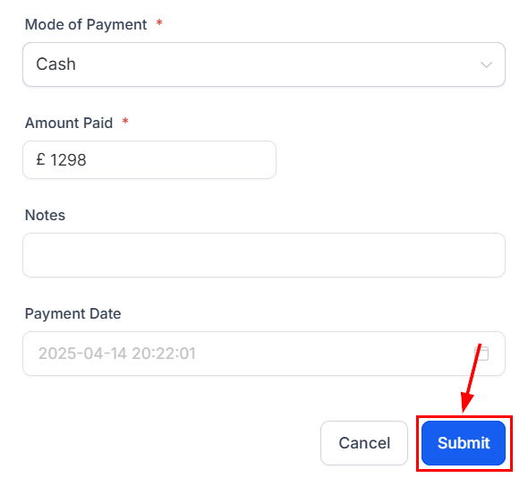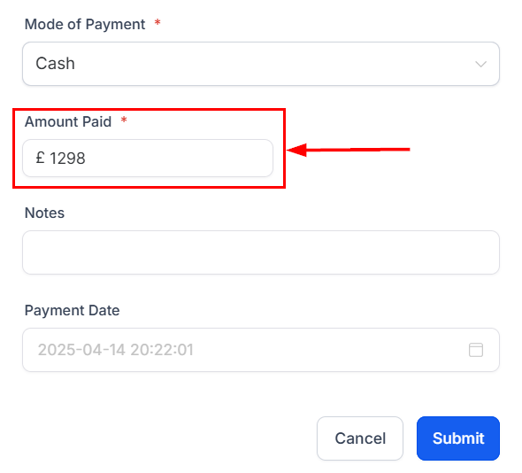 Next, enter the payment amount. By default, the system will populate the full invoice amount. For partial payments, the remaining balance will be displayed accordingly.