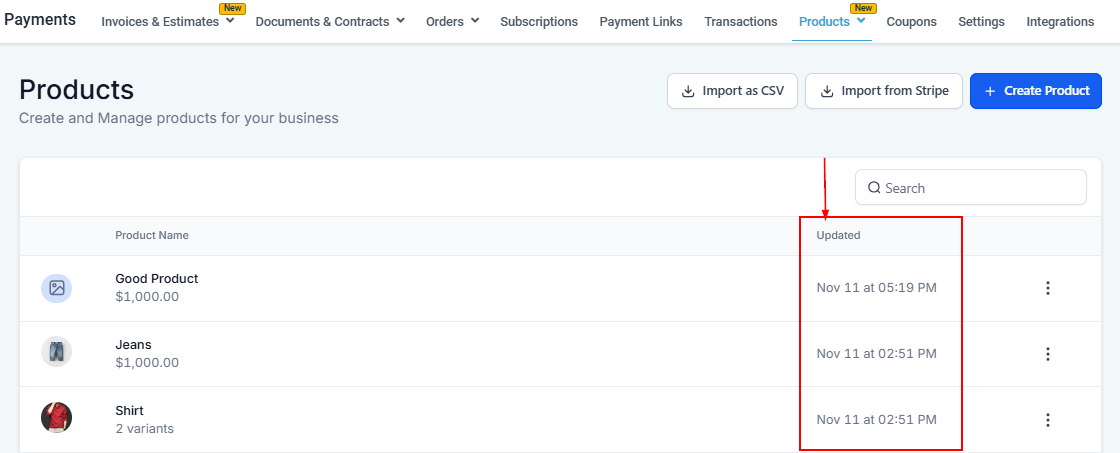 The Products tab in the Payments section of your CRM allows you to manage all your product listings, whether you are uploading them via CSV, importing them from Stripe, or creating new products from scratch. This feature provides an easy way to handle your offerings and ease the purchasing process for your clients while maintaining an organized view of your products.