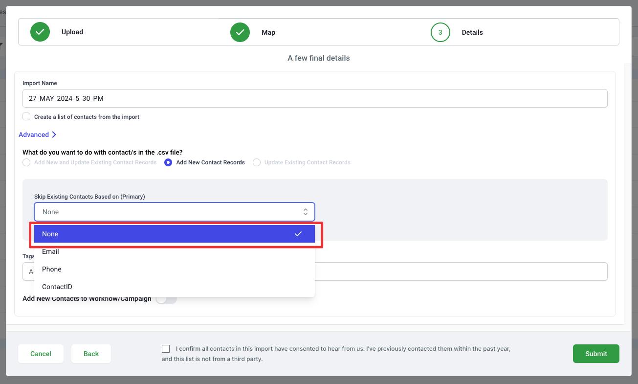 Under Skip Existing Contacts Based On, select None. This setting instructs the CRM to bypass the default behavior of identifying duplicates based solely on email addresses, enabling the system to create new records for individuals with shared contact details.