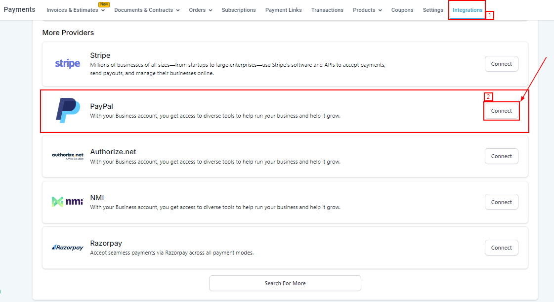 Do you currently accept payments using PayPal? Take advantage of connecting your PayPal account to your CRM. Within the Payments tab, visit the Integration section, and scroll down to locate the PayPal option, once found, click on the Connect button – to gain access to payment credentials used to authenticate and give permission for payment data flows between your CRM and PayPal.