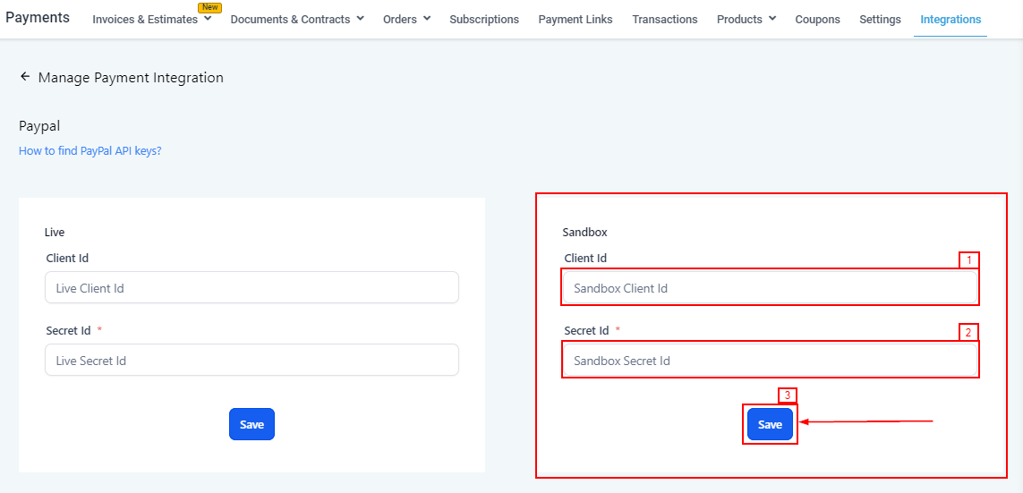 After entering the Sandbox Client ID and Secret ID, make sure to save your information.