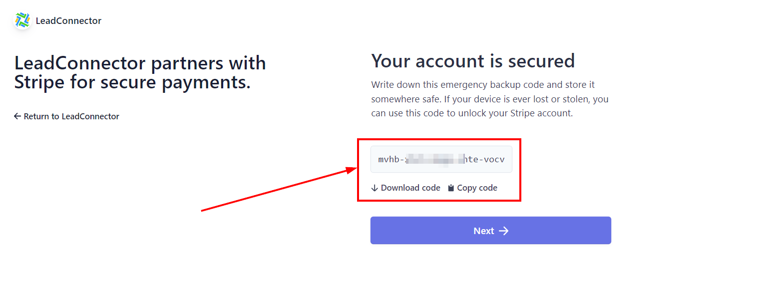 Once your account is secured, you'll receive this code to download or copy and save it somewhere as an emergency backup code in case your device gets lost or stolen before moving to the next step.