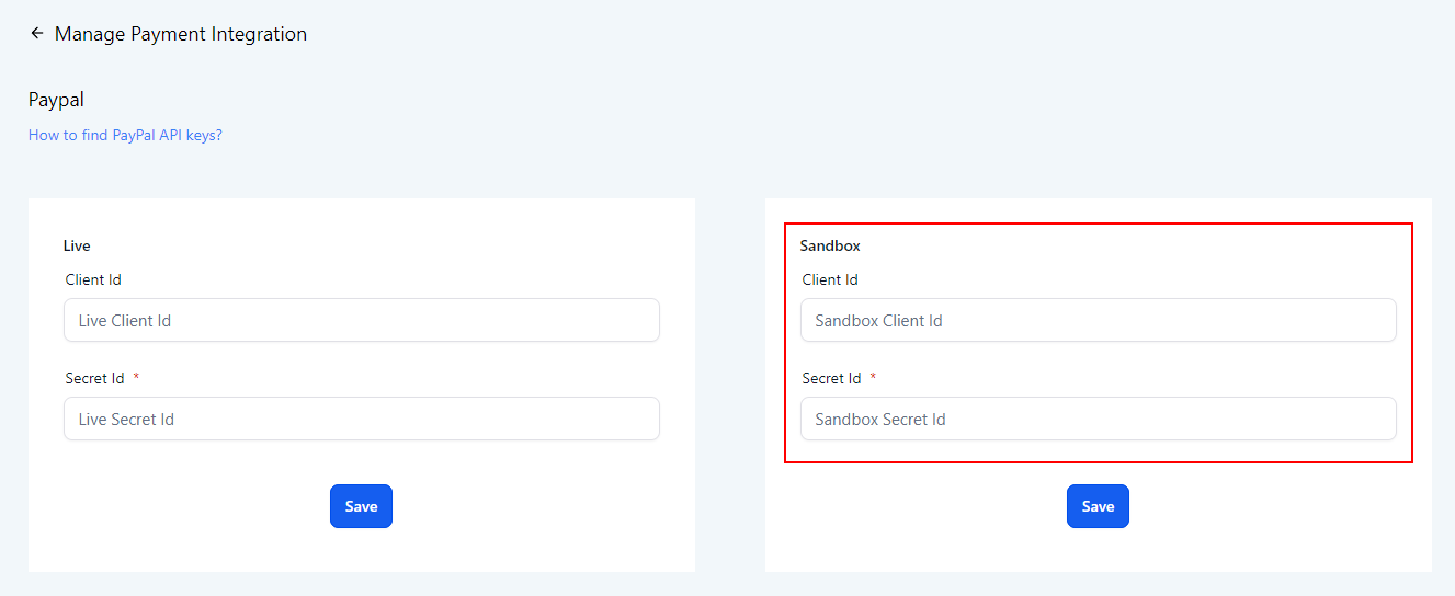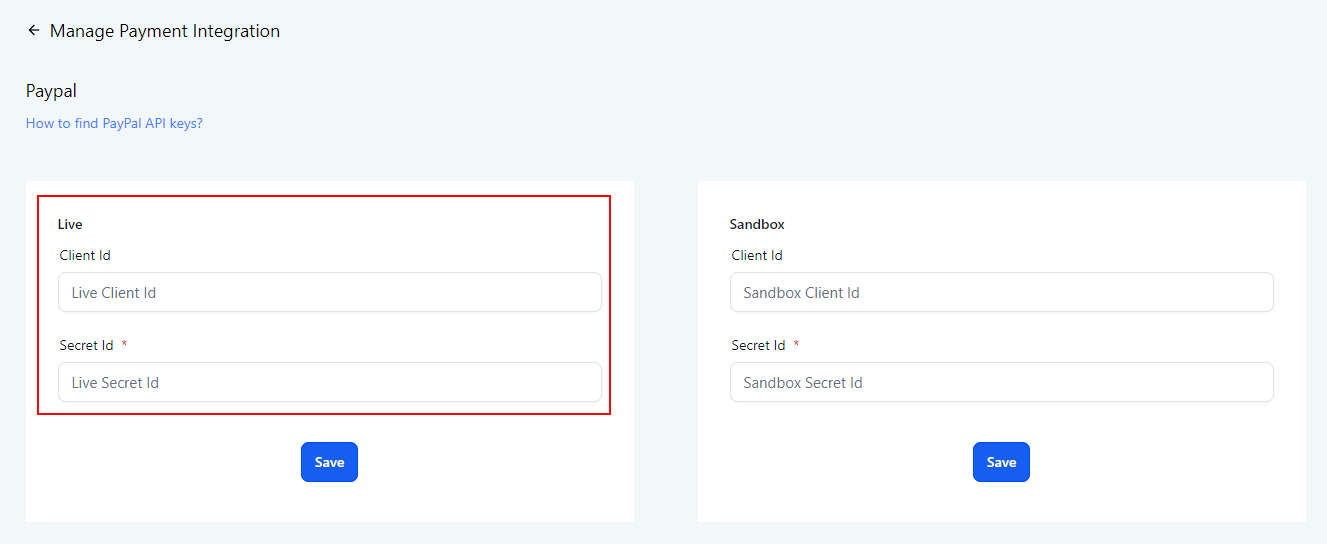 Once you have acquired the keys, please head to Payments> Integrations in your subaccount. Then fill out the respective fields with their keys and hit Save: