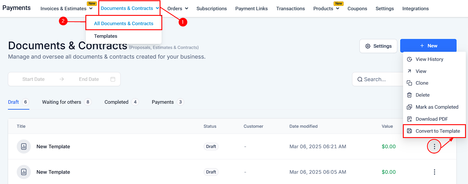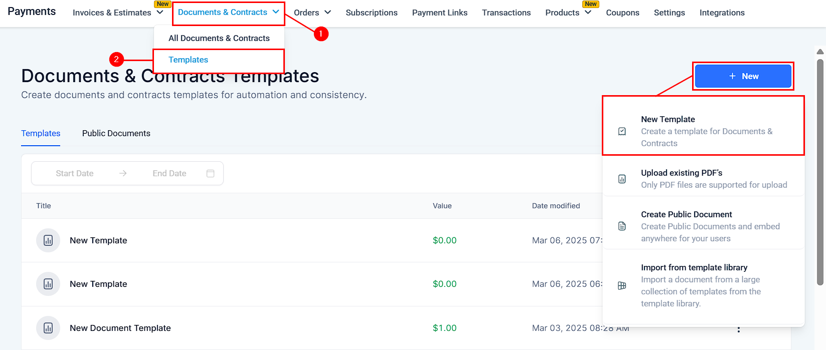 To create a new template for documents & contracts, navigate to the Payments Section, access the Documents & Contracts section in your account, and then go to the Templates page. Once there, click on +New > New Template. This will open a new template editor where you can add all necessary details, including text, pricing information, and signature elements.